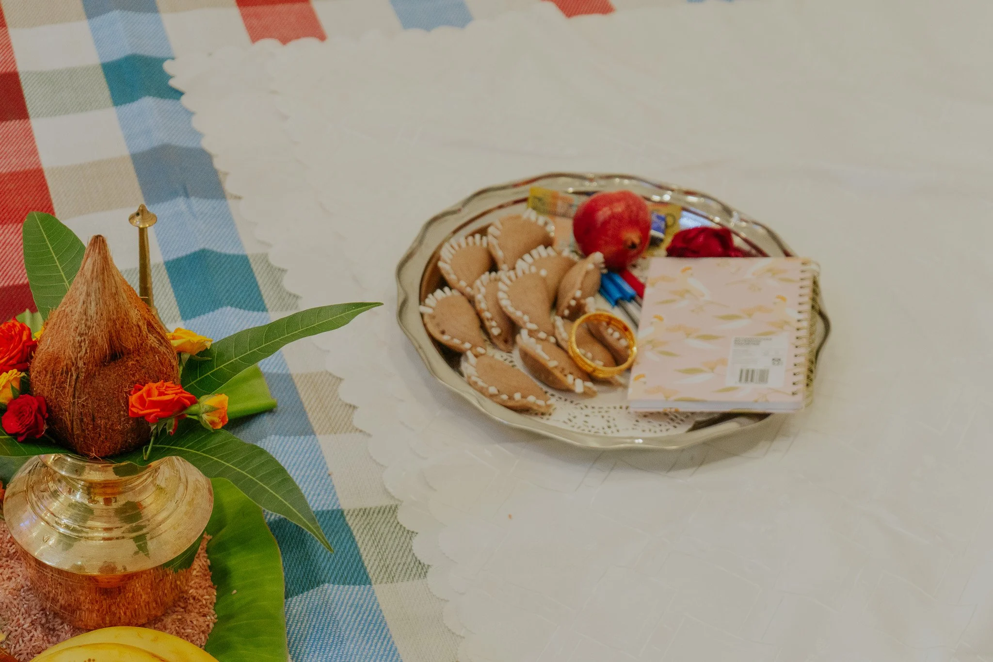 The Fortune-Telling Game: Along with the kozhukattais, symbolic items usually include a book (knowledge), gold (wealth), and money (prosperity). In this session, our little star bypassed the gold and reached fornot one, but two pens! It looks like we have a prolific writer or scholar in the making.