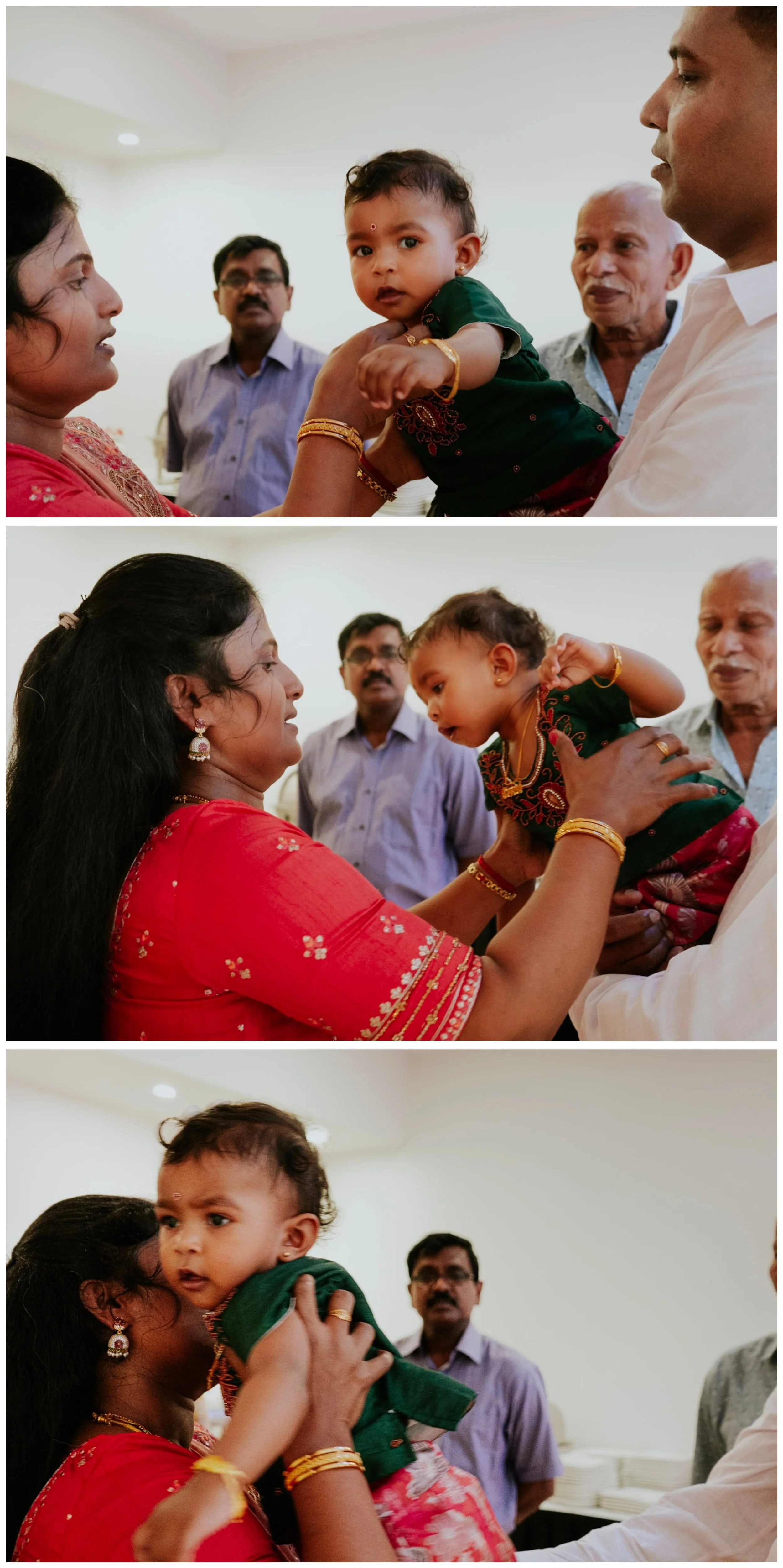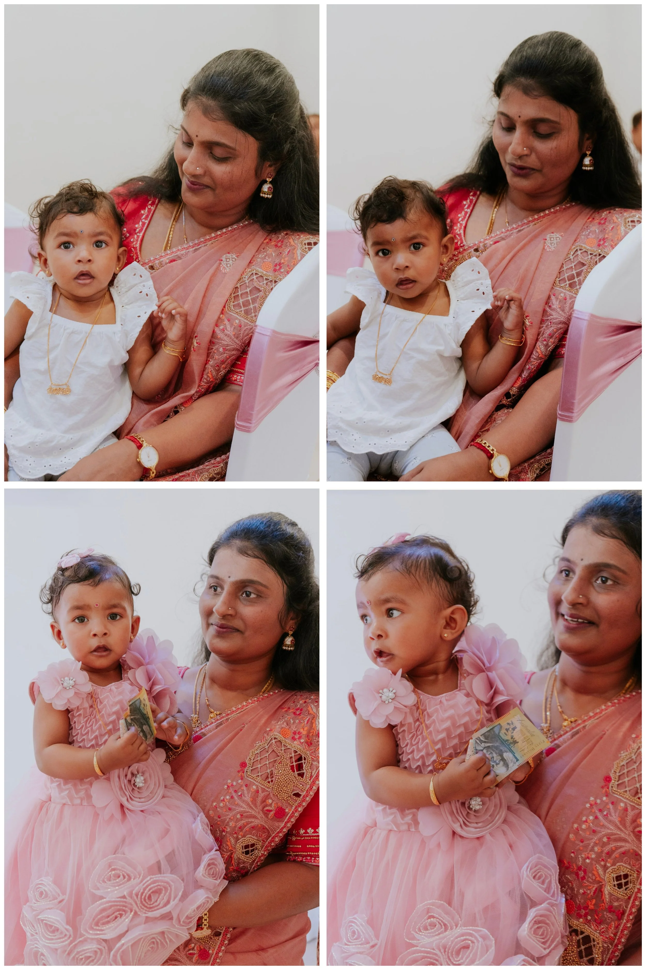 The Kozhukattai Rain: The most iconic visual of the day. A white lace cloth or a traditional arisi murum (rice sieve) is held over the baby’s head while the family pours a "rain" of kozhukattais and other symbolic items over the baby (all gently gently yes!)